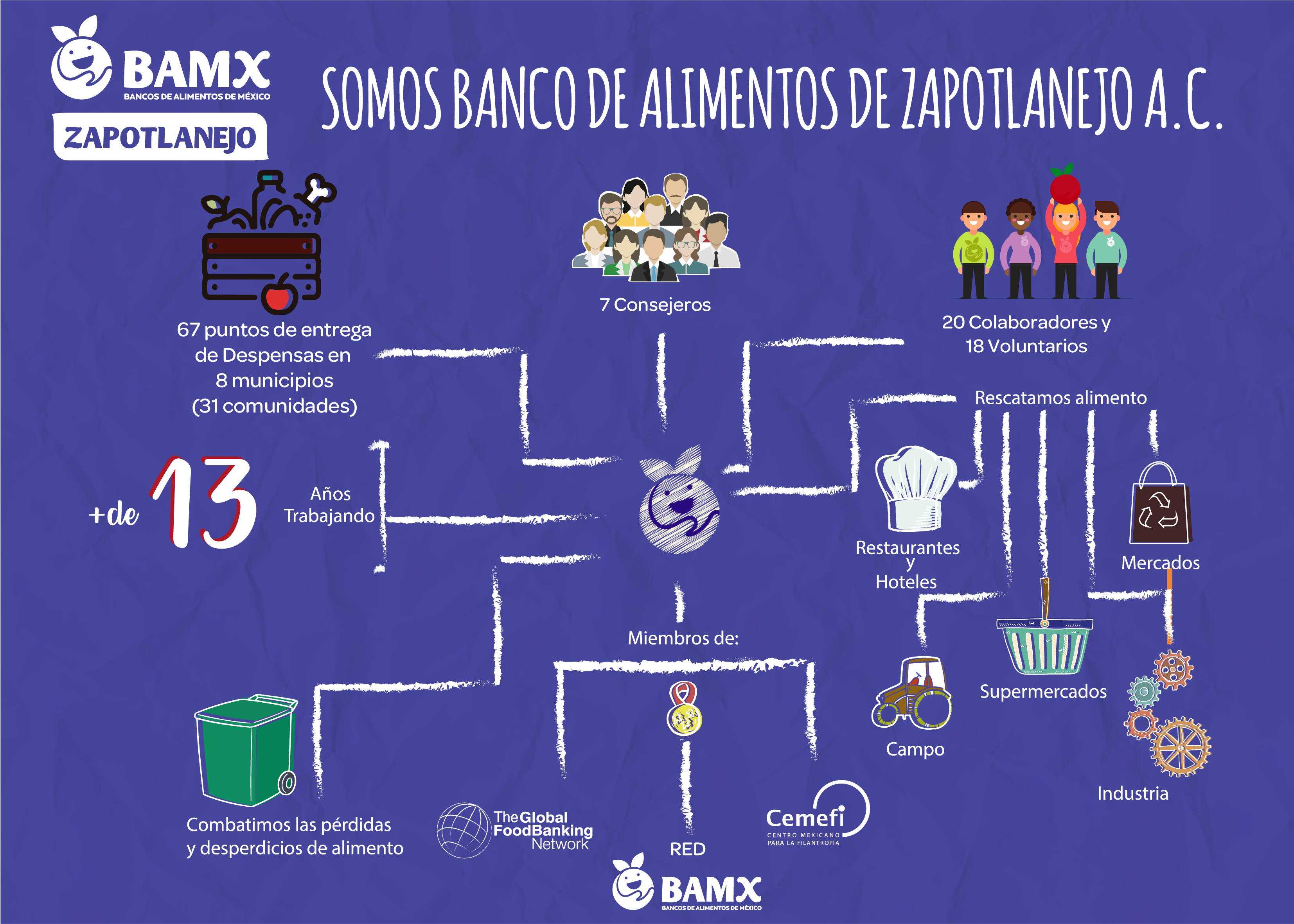 Banco de Alimentos de Zapotlanejo forma parte de BAMX, siendo uno de los 53 bancos de alimentos en México distribuidos en prácticamente todo el territorio nacional, en 27 estados de la república.
